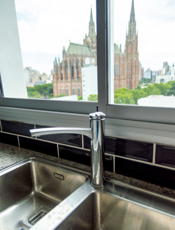 Las ventanas de todo el edificio están resueltas en aluminio anodizado natural línea Módena 45ª o similar, con vidrios 3+3 de seguridad, en grandes ventanales. Las aberturas del frente se desarrollan en las más amplias dimensiones otorgando de esta manera excelente ventilación e iluminación y una impactante vista a la ciudad. El contrafrente cuenta con una imponente vista de la Catedral, ubicada a pocos metros.